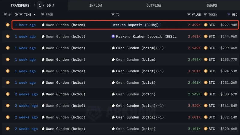 20日、オンチェーン分析アカウントLookonChainによると、グンデンは約1時間前にクラーケン(Kraken)取引所へ2499BTCを入金した。これは約2億2800万ドル規模に相当する。