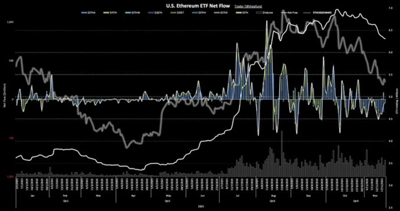 20日(現地時間)、暗号資産(仮想通貨)専門アカウントTraderTによると、この日にイーサリアムETFから合計3890万ドル規模の資金が流出した。ブラックロックのETHAから2614万ドルが流出し、グレースケールのETHEでも1569万ドルの純流出となった。