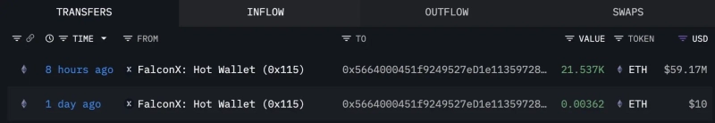 - ビットマインと推定されるウォレットがファルコンXから2万1537ETHを受領したと伝えた。