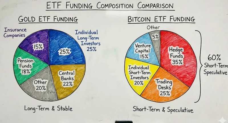 金ETFの資金構成を見ればその差は明白だ。中央銀行が22%、年金基金が18%、保険会社が15%を占め、個人の長期投資家が25%、その他が20%を構成する。一方ビットコインETFはヘッジファンドが35%、トレーディングデスクが25%で全体の60%が短期の投機性資金であり、ベンチャーキャピタル15%、個人の短期投資家20%、その他5%で構成されている。