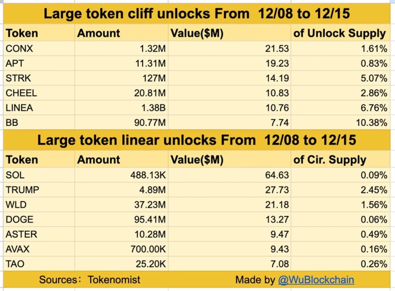 日単位で100万ドル以上が解放されるトークンのアンロックも多数待機しています。ソラナ(SOL)、オフィシャルトランプ(TRUMP)、ワールドコイン(WLD)、ドージコイン(DOGE)、アスター(ASTER)、アバランチ(AVAX)、ビテンサー(TAO)などです。