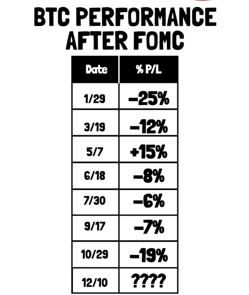 9日(韓国時間)、仮想資産アナリストのアリ・マルティネスはX(旧Twitter)で「今年行われた7回のFOMC後のビットコインの動きを分析した結果、1回を除く6回はいずれも下落した」と伝えた。