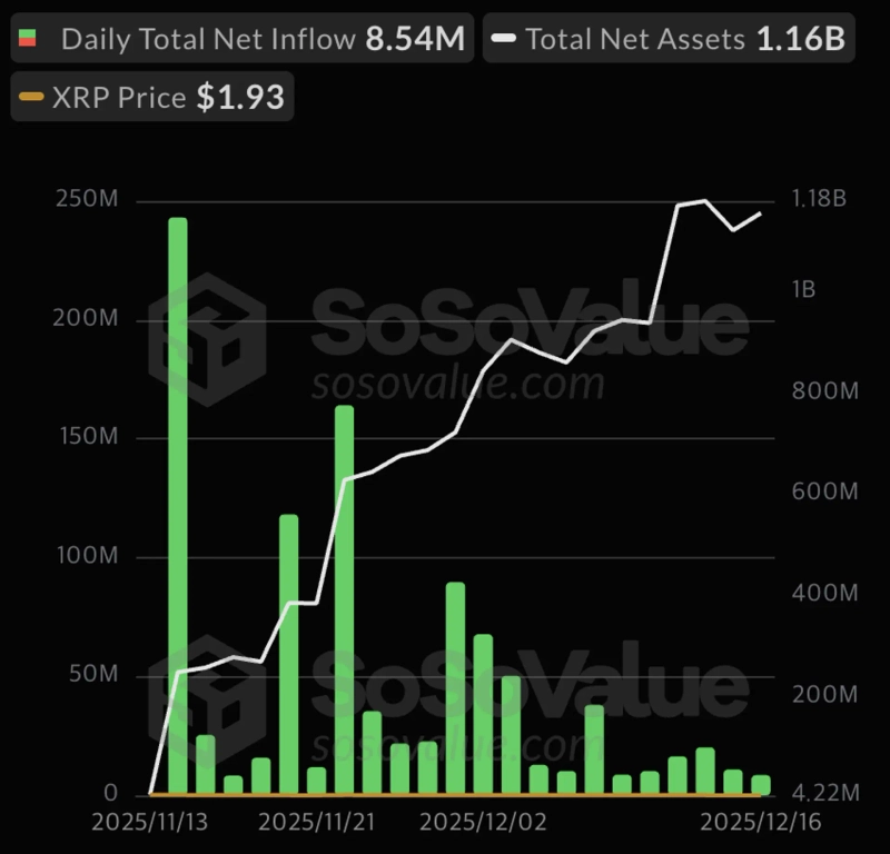 - ソソバリューは、米国のエックスアールピー(XRP)現物上場投資信託(ETF)が22取引日連続で資金の純流入を記録し、累積純流入額が10億ドルを突破したと明らかにした。