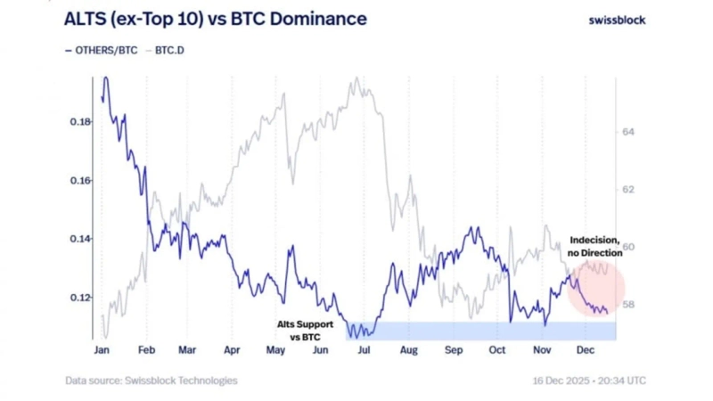 ただしアルトコイン市場の構造自体が崩壊したわけではないとの分析もある。スイスブロックは「アルトコインは過去6か月で形成したビットコインに対する複数月の支持線を依然として維持している」とし、「この構造が維持される限り市場を完全に否定的に断定するのは難しい」と述べた。続けて「(年末を控え)短期の流動性は流入していないが、長期の流動性はまだ維持されている」と付け加えた。