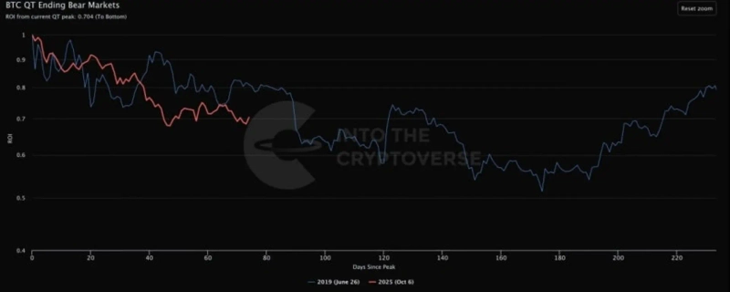 仮想資産分析家ベンジャミン・コーエンは「量的引き締め(QT)の終了や利下げを待っていた投資家が、実際の政策転換後にも期待した価格反応が現れないために諦める動きが出ている」と診断した。彼は「米連邦準備制度理事会(Fed・連準)がより積極的に利下げを行う前までは、現在と同様の市場の流れが続く可能性が高い」とし、「過去の弱気相場は平均で約1年続いた点を考慮すると、今後約4か月間は低い高値と低い安値が繰り返される局面が続く可能性がある」と付け加えた。続けて「現在も長期的には機会を作っている過程だ」と評価した。