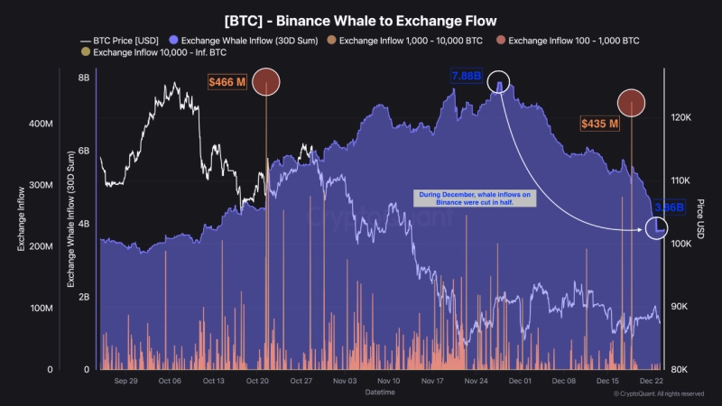 ダークフォスト(Darkfost)、CryptoQuant寄稿者は24日(現地時間)CryptoQuantを通じて「バイナンスに流入したクジラ資金が先月78億8,000万ドルから今月38億6,000万ドルに減少した」とし「わずか数週間で(流入量が)事実上半減した」と述べた。ダークフォストは「これは市場の力学の観点から重要なシグナルであり」「市場に影響力の大きい大口投資家がバイナンスに預けるビットコインが大幅に減ったことを意味する」とした。