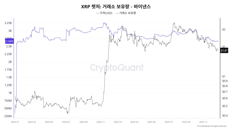 ただし一部にはポジティブな兆候も出ています。クリプトクォントによれば26日時点でバイナンスに保管されているXRPの取引所残高は約2,660,000,000枚まで減少しました。これは昨年7月以降で最も低い水準であり、取引所残高の減少は直ちに市場に放出される可能性のある売り圧力が減っていることを意味し、反発の余地を残す要素と見られます。