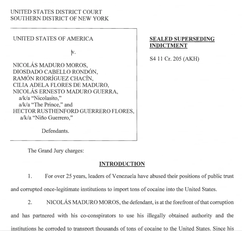 起訴状は、彼らが麻薬収益で自らの権力を強固にし、違法に得た権限を利用して数千トンのコカインを米国へ輸送したと明記した。米国を標的とした"絶え間ないコカイン密売キャンペーン"を展開し、その結果として"数千トンのコカインが米国に配布"されたと付け加えた。