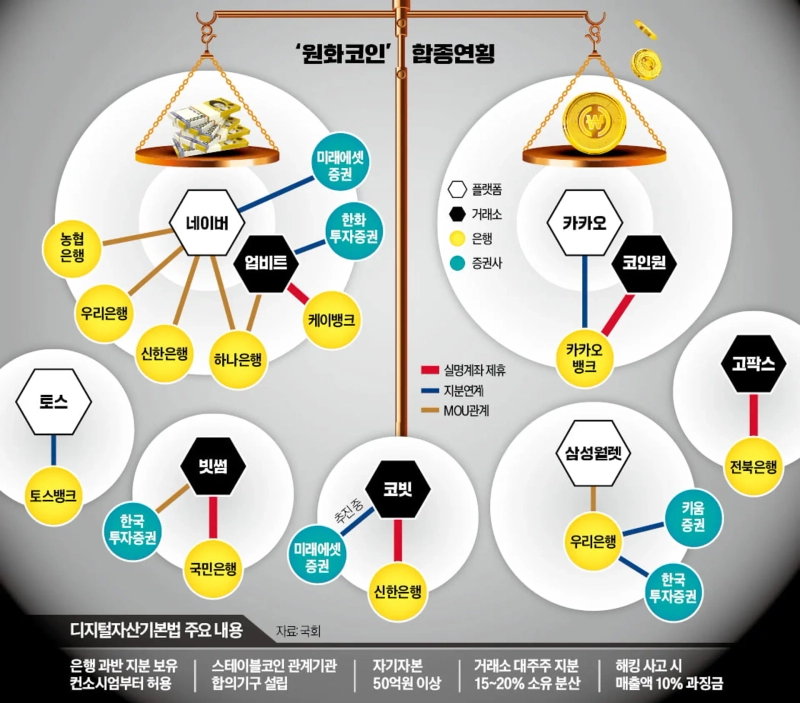 国内金融界の「ウォン建てステーブルコイン」争奪戦が本格化する前兆を見せている。ゲームのルールとなるデジタル資産基本法の輪郭が徐々に明らかになってきたためだ。国民、シンハン、ハナ、ウリ、農協などの5大銀行を中心にプラットフォーム、仮想資産取引所、証券会社、カード会社等が絡む大規模な合従連衡が予告され、金融界の駆け引きも激化するとみられている。