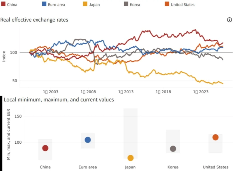 BIS(国際決済銀行)が世界64カ国を対象に毎月集計する実質実効為替レートを見ると、日本円は昨年11月時点で63位、ウォンは60位でした。ウォンの下落も衝撃的ですが、円はさらに深刻でした。