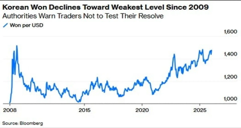 こうした中、14日(現地時間)に**スコット・ベセント米財務長官が異例にウォン/ドル相場の下落に歯止めをかける介入的発言(口先介入)**を行いました。ク・ユンチョル副首相と会談した直後、「為替市場の過度なボラティリティは望ましくない」「最近のウォン安は韓国の堅固な経済ファンダメンタルズと整合しない」との声明を自ら出したのです。2日でほぼ元に戻ったものの、会談前に1478ウォンを超えていた相場は、一気に一時1462ウォンまで急落しました。