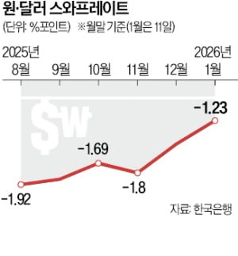 現在、ウォンを借りる際の金利は年2.4%(3カ月物ベース)程度で、米国でドルを借りる際の金利である年3.6%より低い。少なくともこの差である1.2%ポイント分は利息を支払ってこそスワップ取引が成立する。加えて、米国は基軸通貨国でドル需要が大きいため、金利差を上回るプレミアムが付く。このプレミアムに当たる上乗せ金利まで加えて算出されるのが「スワップレート」だ。