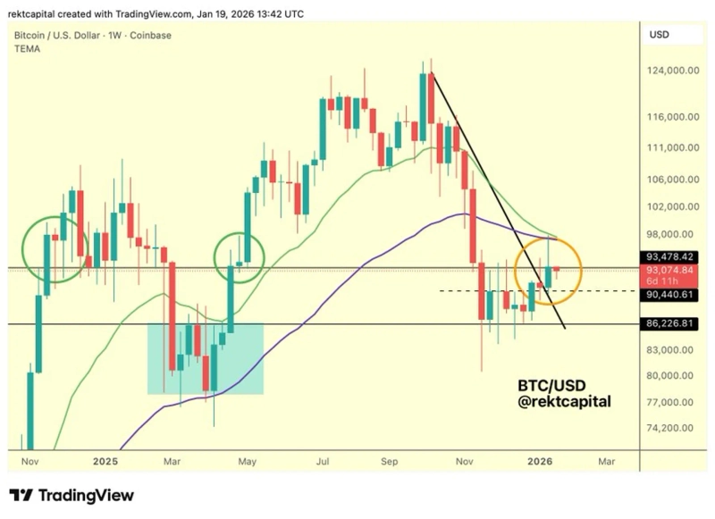 20日(現地時間)、暗号資産(仮想通貨)アナリストのレクト・キャピタル(Rekt Capital)はXで、「ビットコインは強気相場の局面を定義する複数の指数移動平均(EMA)が密集するゾーンで上値抵抗に直面し、9万3500ドル水準について『ブレイク後の押し戻し(post-breakout retest)』の値動きを示している」と伝えた。