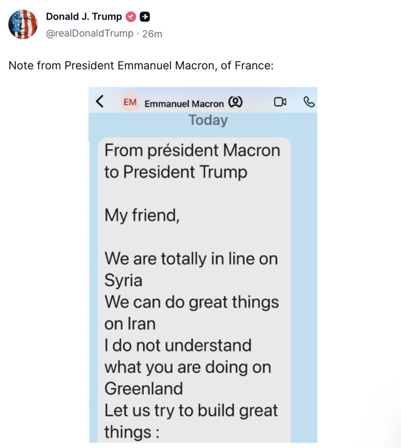トランプ大統領は20日、トゥルース・ソーシャルに「フランスのマクロン大統領が送ってきたメモ」として、メッセージ画像を投稿した。公開されたSMSでマクロン大統領は、「グリーンランドに関して、あなたが何をしているのか理解できない」と述べた。