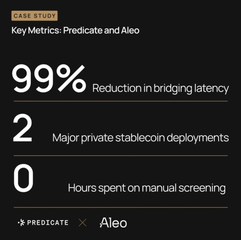 - Aleoはプレディケイトと協業してARC-100のリスク管理基準を通過し、自動化されたリアルタイム・スクリーニングの導入により、ブリッジの入金待機時間を24時間から約15分へ99%短縮したと伝えた。