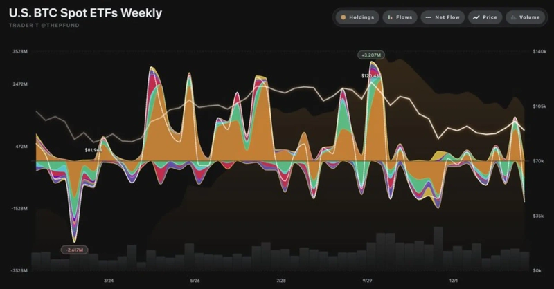 26日(現地時間)、トレーダーTによると、先週のビットコイン現物ETFでは約13億2300万ドル(約1兆9043億ウォン)の純流出が発生した。同期間の取引高は170億ドルと集計された。