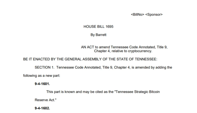 - 法案が可決されれば、テネシー州政府は公的資金の一部をビットコインに投資し、備蓄戦略を策定できるようになると伝えた。