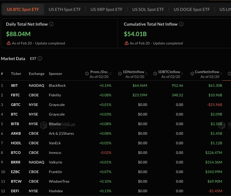 20日(現地時間)SosoValueのデータによると、米国のビットコイン現物ETFの1日当たりの純流入額は8,804万ドルだった。