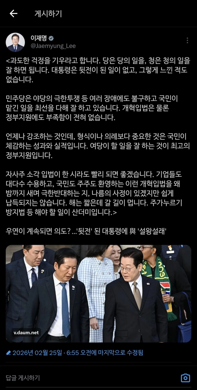 大統領は「いつも強調していることだが、形式や儀礼より重要なのは国民が実感する成果と実績だ」とし、「与党がやるべきことをきちんとやることが、最高の政府支援だ」と書いた。