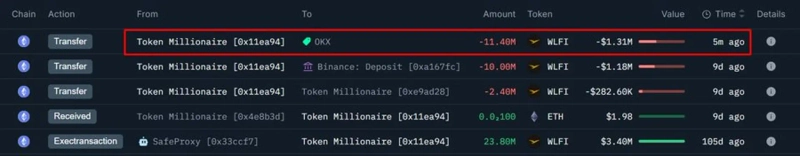 27日(韓国時間)、オンチェーン・レンズによると、ワールド・リバティ・ファイナンシャルは約10分前にOKXへWLFIトークン1140万枚を入金した。これは現時点のレートで約131万ドル相当となる。