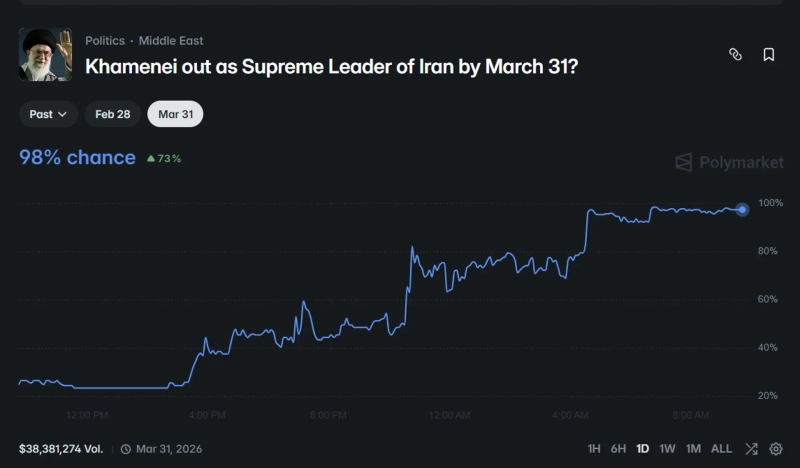 1日(韓国時間)、分散型予測市場のポリマーケットによると、「3月31日までにハメネイ最高指導者は退任するか」というベットで、トレーダーはハメネイ師が失脚する確率を98%と予測している。