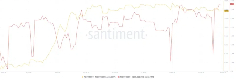 6日(韓国時間)、ザ・クリプト・ベーシックはサンティメントのデータを引用し、10月10日の暗号資産(仮想通貨)急落局面の発生時点から現在までに、XRPのクジラ(トークン保有量1,000万〜10億枚)が合計41億8,000万枚のXRPを追加購入したと報じた。
