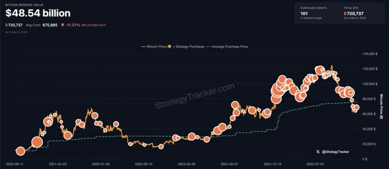 ストラテジーの直近の購入は2月最終週に行われた。当時同社は約2億400万ドルを投じて3015 BTCを追加取得し、総保有量は72万737 BTCに増加した。報道時点で約481億ドル規模に相当する。