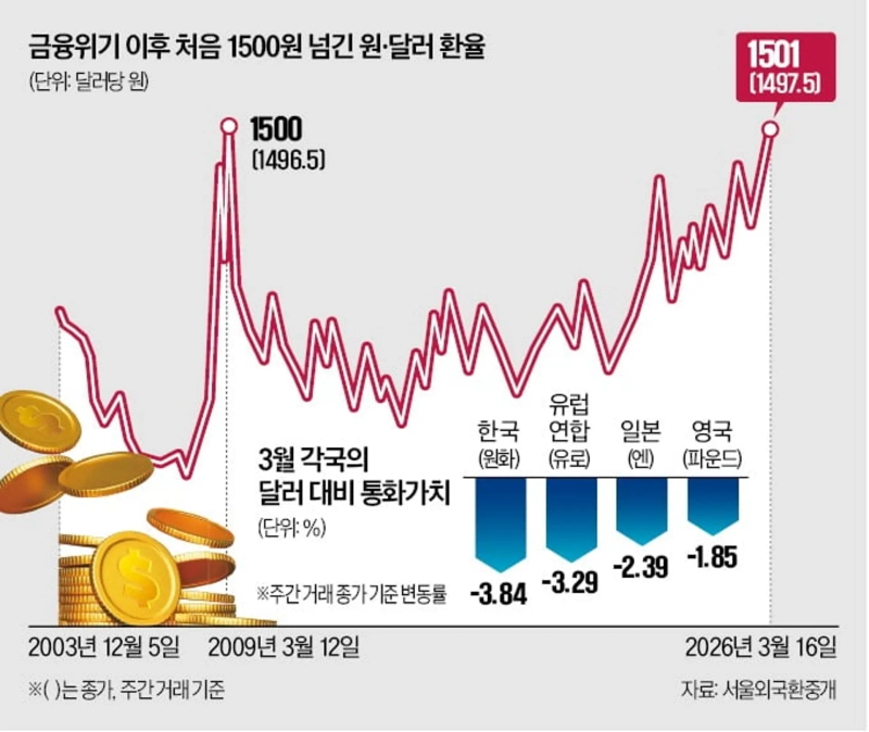 韓国ウォン・ドル相場は16日の日中取引で一時1500ウォンを突破した。オフショア取引ではなく正規市場で1500ウォンを上回ったのは、世界金融危機期の2009年以降で初めて。米国・イラン戦争の長期化に伴う原油価格急騰でスタグフレーション(高インフレ下の景気後退)懸念が広がり、安全資産であるドルが買われた影響だ。外為当局は適切なタイミングで市場安定措置を講じ得るとしつつも、介入には慎重だ。原油がさらに上昇すれば相場が1550ウォン台まで急騰する可能性もあるだけに、口先介入カードや外貨準備を取り崩す局面ではないと判断しているとみられる。