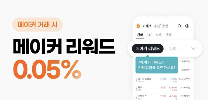 Bithumbは20日、KRWマーケットの暗号資産100銘柄を対象に、メイカー(指値)注文の約定時に0.05%のリワードを提供するイベントを実施すると発表した。