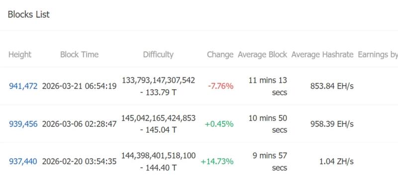 21日(韓国時間)、Wu BlockchainはClovepoolのデータを引用し、941,472番目のブロックでビットコインのマイニング難易度が前回比7.76%低下し、133.79Tに調整されたと報じた。