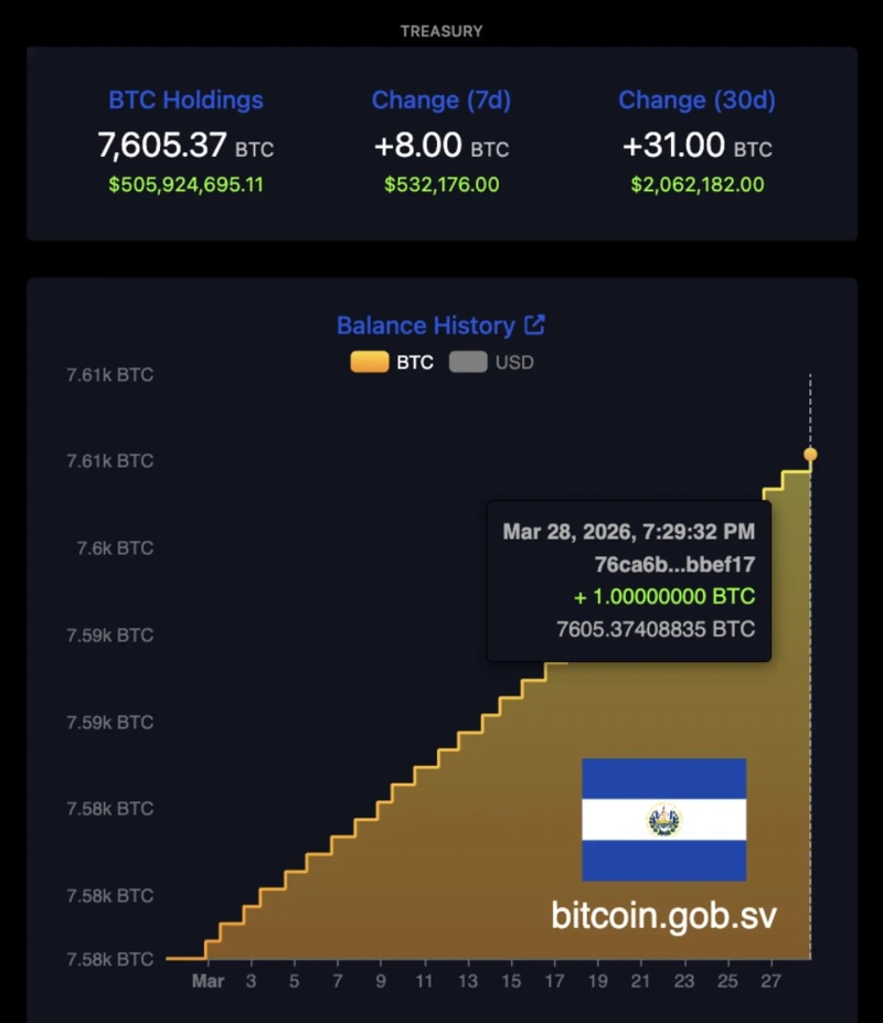 29日(現地時間)、エルサルバドルの公式機関「ビットコイン・オフィス(The Bitcoin Office)」によると、国家戦略ビットコイン準備金は7,605.37 BTCに増加した。これは約5億600万ドル規模に相当する。