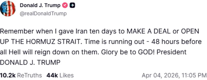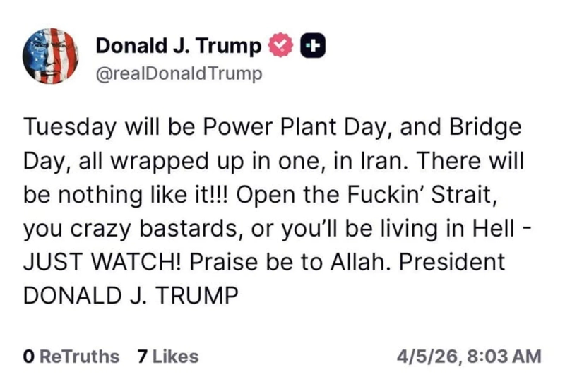 トランプ大統領は同日午前、ソーシャルメディア「トゥルース・ソーシャル」に、7日にイランの発電所や橋梁など主要インフラに対する大規模攻撃を加えると予告し、ホルムズ海峡の開放と合意妥結を迫った。「くそったれの海峡を今すぐ開け、この狂った連中め。そうしなければ地獄で生きることになるだろう。アッラーを讃えよ」など、卑語を交えて罵倒した。