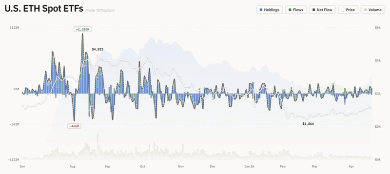 トレーダーTによると、4月20日のイーサリアム現物ETFへの資金流入は差し引き6777万ドルの純流入だった。純流入は8取引日連続となった。