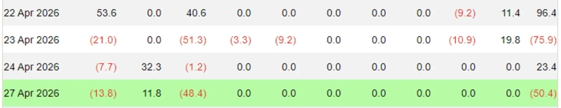 ファーサイド・インベスターズによると、4月27日の米イーサリアム現物ETFの純流出額は合計5040万ドルだった。前日に純流入へ転じた後、再び純流出に転じた。