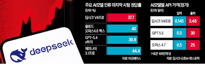ディープシークが4月24日に発表したこのモデルは、性能が期待に届かなかったとの評価を受けた。「ディープシーク・ショック」を呼んだV2モデルに比べ、市場への波及力も限られた。V4 Proは数学、物理学、生物学など2500問に答える「Humanity's Last Exam(HLE)」で正答率37.7%だった。グーグル(Google)の「Gemini 3.1 Pro」の44.4%、Opus 4.6の40%を下回った。
