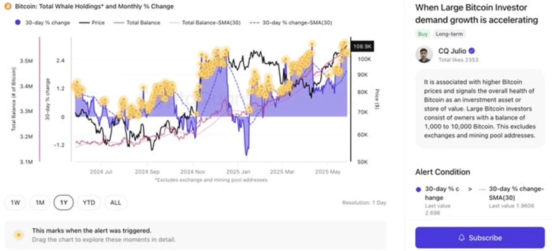 CryptoQuantは「過去にもこのような大規模ウォレット増加傾向は中長期的に価格上昇と関連していた」と強調しました。