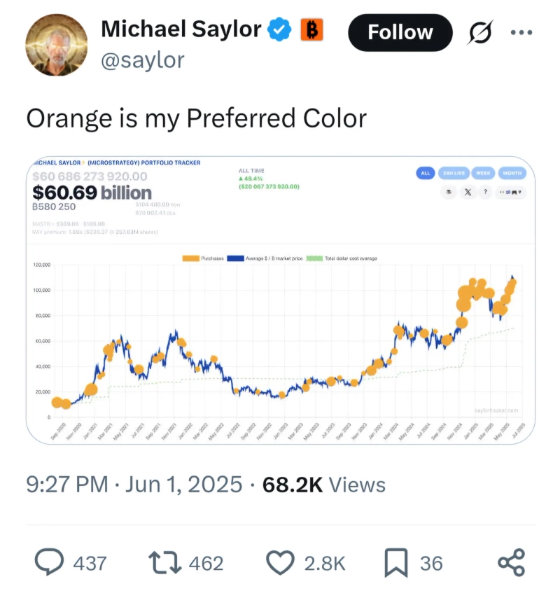 1日(現地時間)、マイケル・セイラー ストラテジー最高経営責任者(CEO)はエックス(旧ツイッター)を通じて「オレンジは私の好みの色だ」とし、「セイラー・トラッカー・チャート」を共有しました。