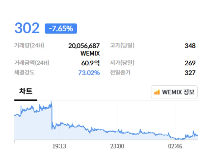 2日(韓国時間)午後1時47分現在、WEMIXは国内取引所Bithumbで前日比7.65%下落の302ウォンで取引されています。WEMIXはこの日午前6時ごろ269ウォンまで下落しましたが、現在は下落分を一部回復しています。