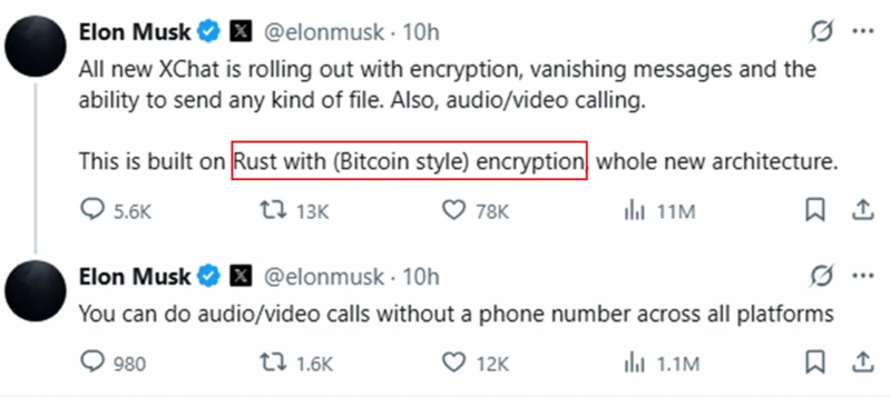 これに先立ち、マスクは自身のXでXChatを紹介した。マスクは「XChatは暗号化、メッセージの消去、あらゆる種類のファイル転送機能を備えている」とし、「特にその中のオーディオ・ビデオ通話はビットコインスタイル暗号化を適用したRustを基盤としている」と説明した。