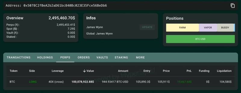 分散型先物取引所(DEX)ハイパーリキッド(HYPE)のクジラとして知られるジェームズ・ウィンが、40倍レバレッジでビットコイン(BTC)のロングポジションを構築したことが明らかになりました。