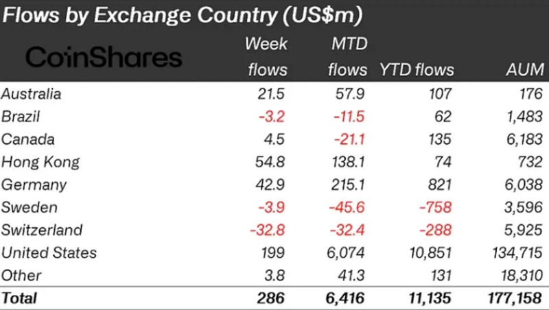 国別では米国発の流入傾向が強く、米国拠点の暗号資産商品だけで約1億9,900万ドルが純流入しました。ドイツ、オーストラリア、香港はそれぞれ4,290万ドル、2,150万ドル、5,480万ドルが流入しました。一方、スイスとスウェーデンはそれぞれ3,280万ドル、390万ドルの純流出を記録しました。