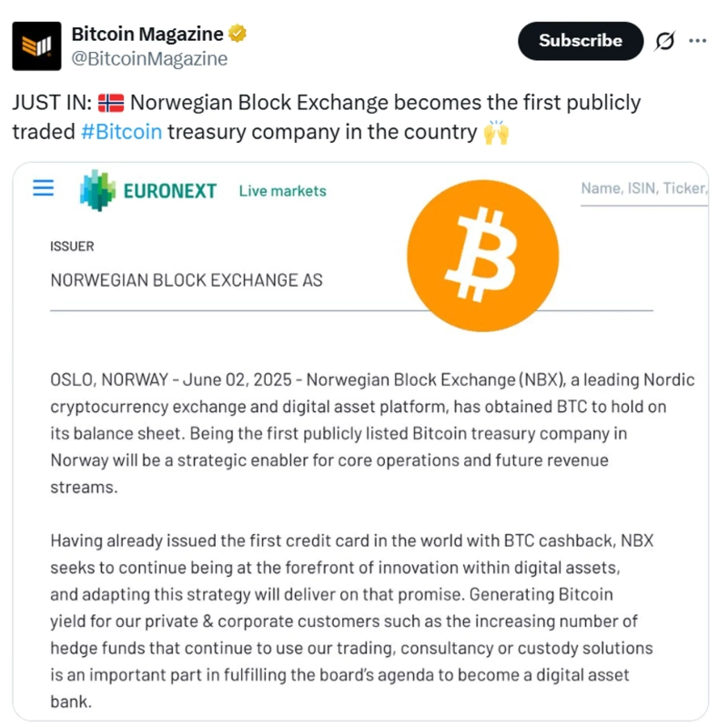 - Norwegian Block Exchangeが自国で初めてビットコイン(BTC)を公式な財務準備資産として保有する上場企業となったと発表しました。