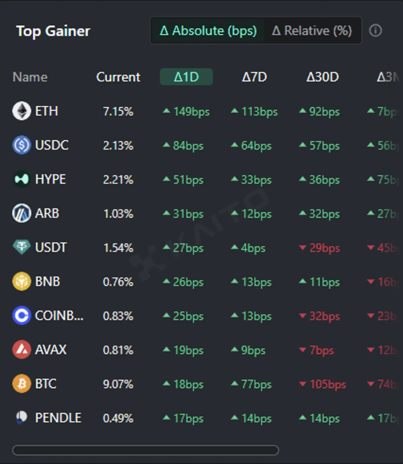 AI(人工知能)ベースのWeb3検索プラットフォーム「カイト(Kaito)」のトークン・マインドシェア(Token Mindshare・仮想資産市場における特定トークンの影響力を定量化した指標)トップゲイナーによると、3日現在、人々が最も関心を示している仮想資産上位5つはイーサリアム(ETH)、USDC、ハイパーリクイッド(HYPE)、アービトラム(ARB)、テザー(USDT)などである。