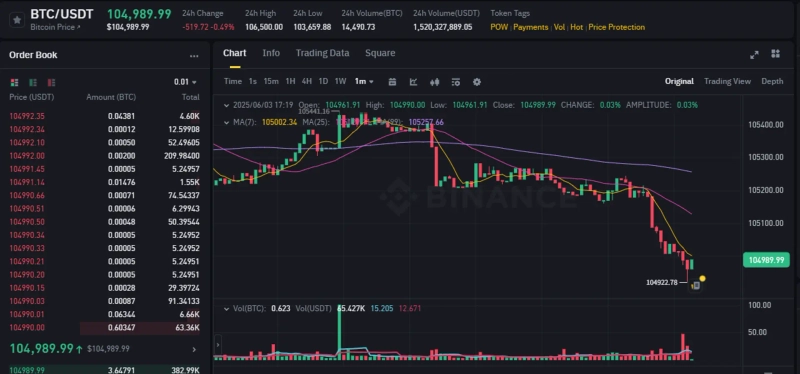 午後5時18分現在、バイナンスのUSDTマーケット基準でビットコインは24時間前比0.49%下落の10万4989ドルで取引されています。