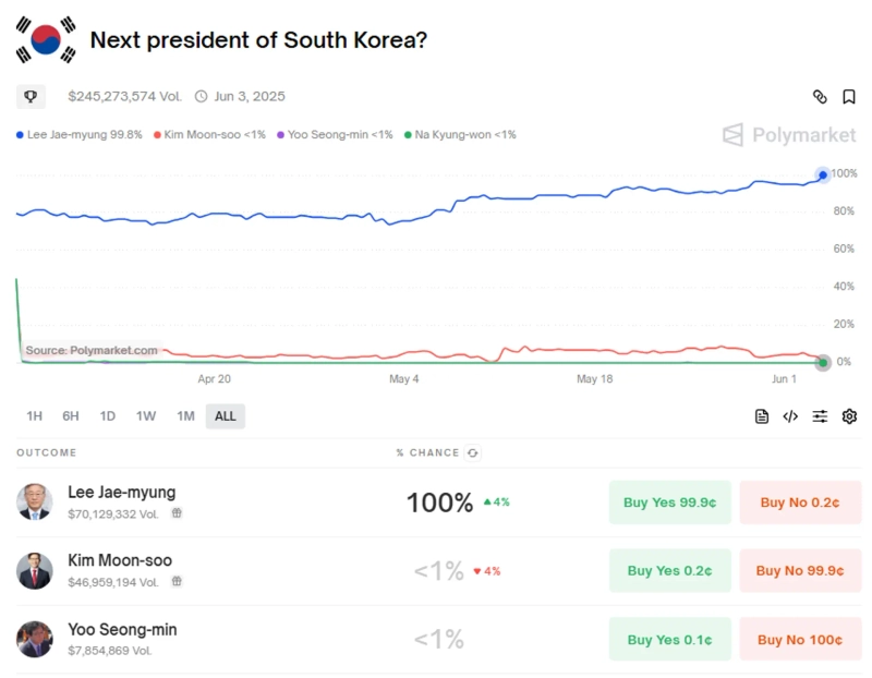 分散型予測プラットフォームPolymarketでイ・ジェミョン共に民主党候補の当選確率が100%に到達しました。