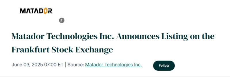 - 『マタドール・テクノロジーズ』がフランクフルト証券取引所に上場したと発表しました。