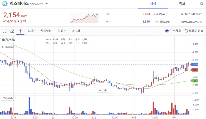 4日(韓国時間)午前8時45分現在、Nexpaceは仮想資産取引所Upbitで前日比14.51%上昇した2,154ウォンで取引されています。