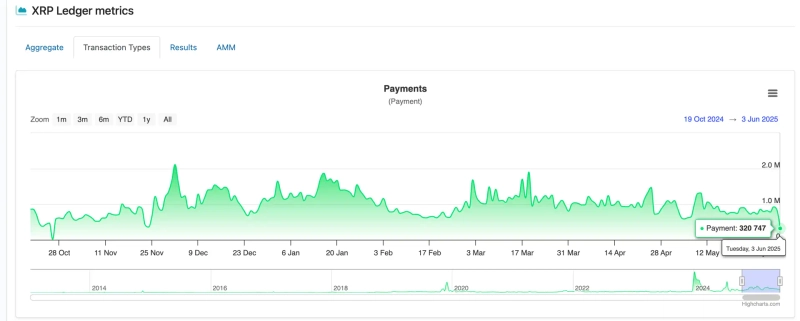 3日(現地時間)、暗号資産(暗号通貨)専門メディアコインデスクは、XRPスキャンのデータを分析し、XRPレジャー内でエックスアールピー決済件数が32万747件を記録し、昨年10月以来の最低値に達したと報じました。