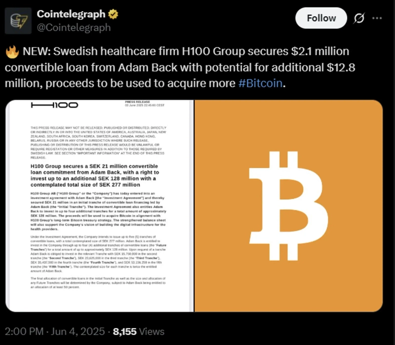 - スウェーデンのヘルスケアグループH100がビットコイン備蓄強化のため、アダム・バックと210万ドル規模の投資契約を結んだと伝えられました。