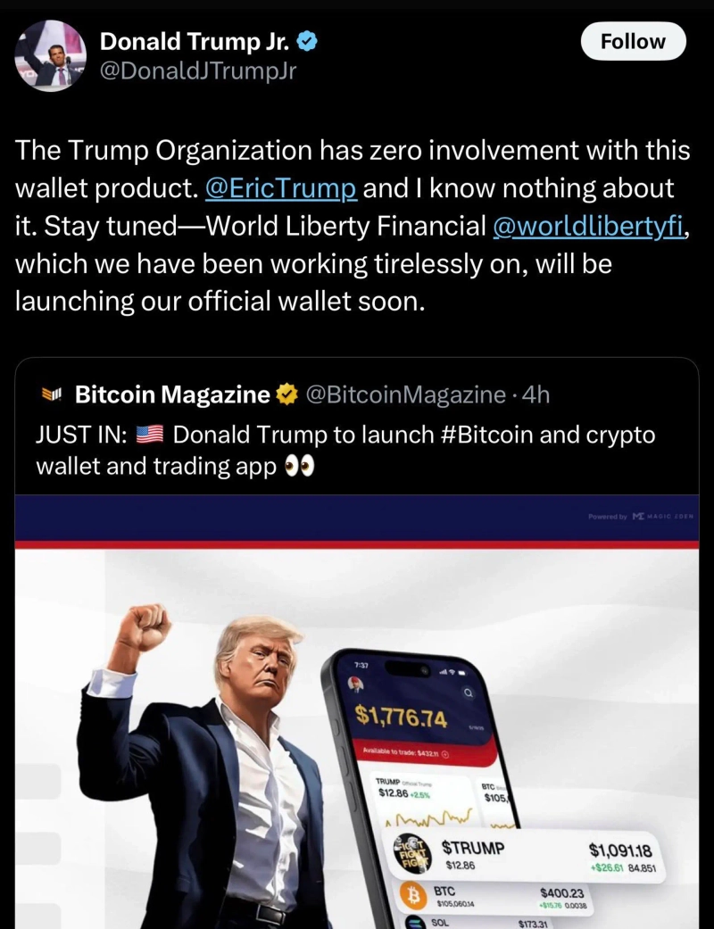 一方、先にエリック・トランプはXを通じて「トランプ・グループはワールドリバティファイナンシャル(WLFI)と協力し、公式ウォレットをリリースする予定だ」と明らかにしたことがあります。